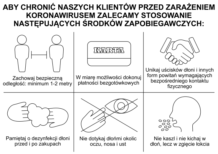 Informujemy, że sklep otwarty jest od poniedziałku do piątku w godzinach 10-17.30 oraz w soboty w godzinach 10-13. Przypominamy jednocześnie o zachowaniu środków bezpieczeństwa podczas zakupów.